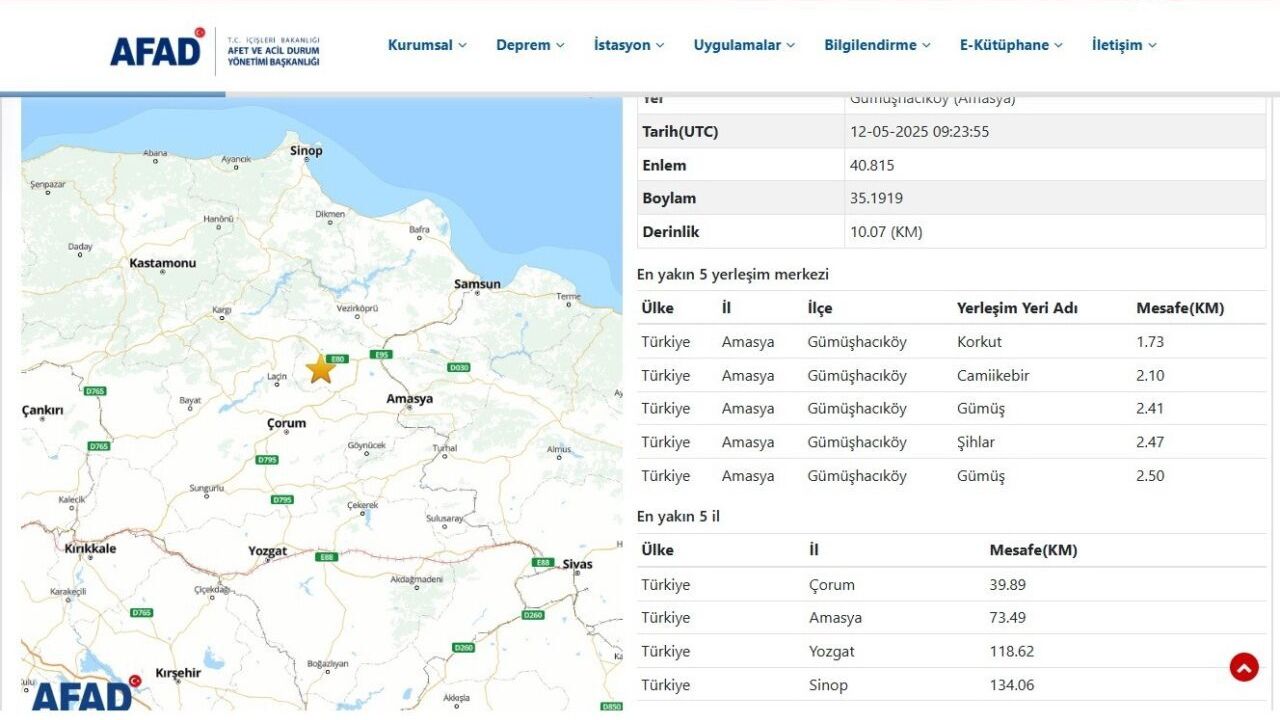 Afet ve Acil Durum Yönetimi Başkanlığı (AFAD) verilerine göre, saat 12.23’te merkez üssü Amasya’nın Gümüşhacıköy ilçesi olan 4.4 büyüklüğünde bir deprem kaydedildi. Yerin 10.07 kilometre derinliğinde gerçekleşen deprem, özellikle Amasya kent merkezi ve ilçelerinde, Samsun’un doğu kesimlerinde ve çevre illerde hissedildi.