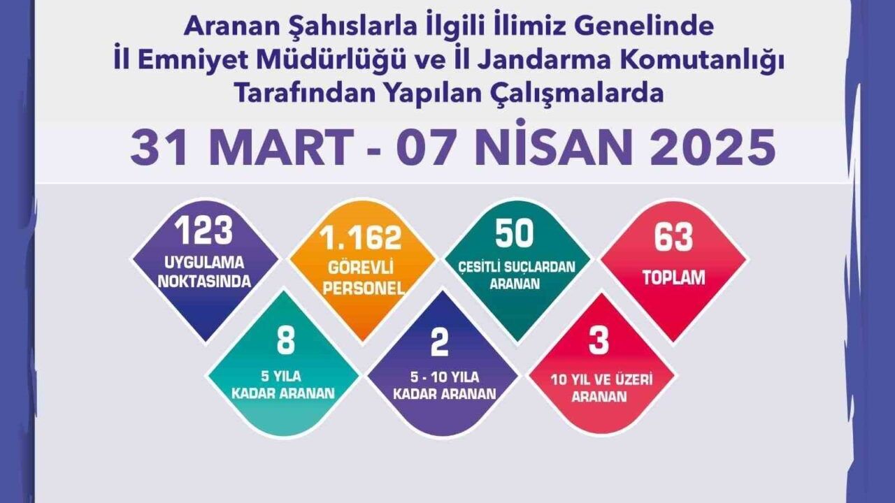 Edinilen bilgilere göre, İl Emniyet Müdürlüğü ve İl Jandarma Komutanlığı ekiplerince aranan şahıslarla ilgili çalışma yapıldı. 31 Mart - 7 Nisan 2025 tarihleri arasında gerçekleştirilen çalışmalar çerçevesinde, kent genelinde 123 uygulama noktasında bin 162 personel görevlendirildi. Ekiplerin çalışmaları sonucunda; 5 yıla kadar aranan 8 şahıs, 5-10 yıla kadar aranan 2 şahıs, 10 yıl ve üzeri aranan 3 şahıs ile çeşitli suçlardan aranan 50 şahıs olmak üzere toplam 63 şahsın yakalandığı belirtildi.