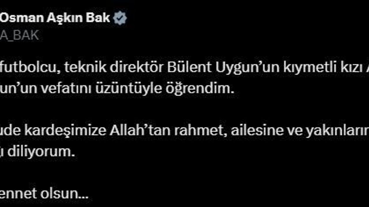 Gençlik ve Spor Bakanı Osman Aşkın Bak, Teknik Direktör Bülent Uygun’un kızı Almina Tude Uygun’un vefatı üzerine başsağlığı paylaşımı yaptı.