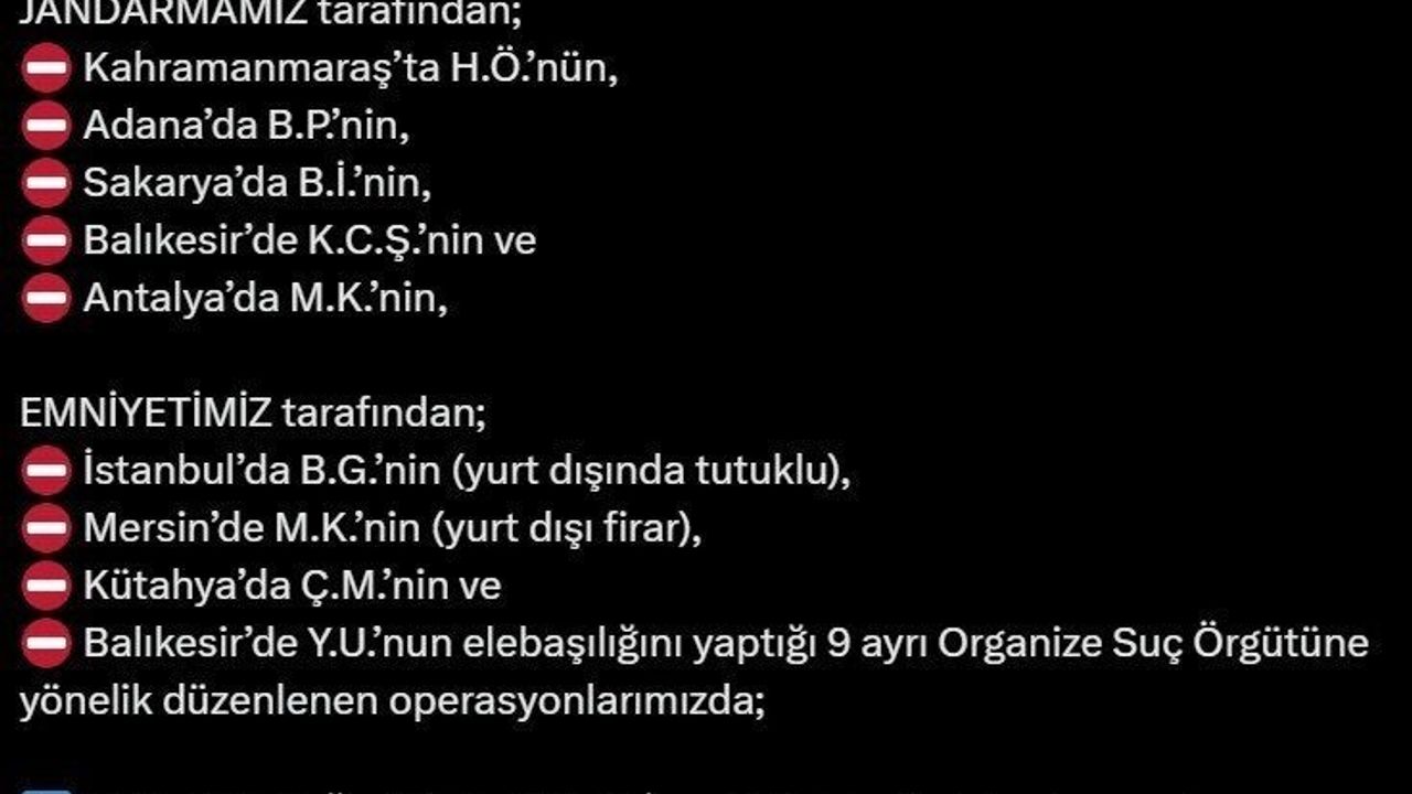 İçişleri Bakanı Ali Yerlikaya, sosyal medya hesabından yaptığı açıklamada, "19-27 Mart 2025 tarihleri arasında emniyetimiz ve jandarmamız tarafından 9 ayrı organize suç örgütü çökertildi, 86 şüpheli tutuklandı. Jandarmamız tarafından; Kahramanmaraş’ta H.Ö.’nün, Adana’da B.P.’nin, Sakarya’da B.İ.’nin, Balıkesir’de K.C.Ş.’nin ve Antalya’da M.K.’nin, emniyetimiz tarafından; İstanbul’da B.G.’nin (yurt dışında tutuklu), Mersin’de M.K.’nin (yurt dışı firar), Kütahya’da Ç.M.’nin ve Balıkesir’de Y.U.’nun elebaşılığını yaptığı 9 ayrı organize suç örgütüne yönelik düzenlenen operasyonlarımızda; Ç.M., Y.U., H.Ö., K.C.Ş., B.P., B.İ. ve M.K. isimli elebaşlarının da içerisinde bulunduğu 142 şüpheli yakalandı. Şüphelilerden 86’sı tutuklandı, 19’u hakkında adli kontrol kararı verildi. Diğerlerinin işlemleri devam ediyor" ifadelerine yer verdi.