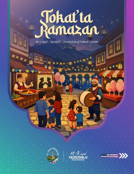 Tokat Belediye Başkanı Mehmet Kemal Yazıcıoğlu, “Tokat’ta Ramazan” programına ilişkin yaptığı açıklamada şu ifadelere yer verdi: “Ramazan ayı; gönüllerin yumuşadığı, sofraların bereketlendiği, kardeşliğin güçlendiği müstesna bir zaman dilimidir. Bizler Tokat Belediyesi olarak bu mübarek ayda hemşehrilerimizi aynı sofrada buluşturmak, kültürümüzü ve kadim Ramazan geleneklerimizi yaşatmak istiyoruz. Terminal karşısındaki etkinlik çadırımızda her akşam saat 20.30’da düzenleyeceğimiz programlarla çocuklarımızdan büyüklerimize kadar herkes için dolu dolu bir Ramazan hazırladık. Aynı zamanda şehrimizin dört farklı noktasında kuracağımız iftar sofralarıyla birlik ve beraberliğimizi pekiştireceğiz. Tokat’ta Ramazan sadece bir takvim ayı değil; gönüllerin buluştuğu, kardeşliğin güçlendiği bir medeniyet iklimidir. Tüm hemşehrilerimizi iftar sofralarımıza ve Ramazan etkinliklerimize davet ediyorum. Rabbim birlik ve beraberliğimizi daim eylesin.”