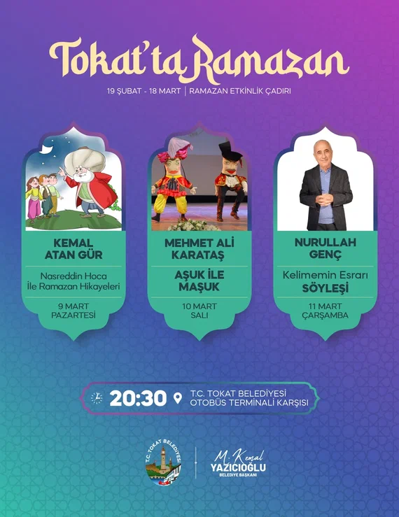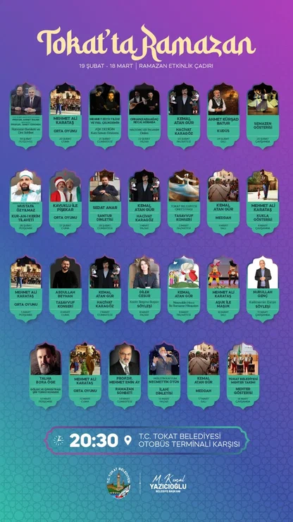 Ramazan Ayı Program Akışı; Mehmet Ali Karataş ile Orta Oyunu ve Kukla Gösterileri, Mehmet Zeyd Yıldız & Veysel Çelikdemir ile Aşk Dediğin Kum Sanatı Gösterisi, Orhan Karaağaç & Recai Ağba ile Mademki Bir İnsanım Dinletisi, Kemal Atangür ile Hacivat-Karagöz, Meddah ve Nasreddin Hoca ile Ramazan Hikayeleri, Ahmet Kürşad Batur ile Kudüs Programı, Mustafa Özyılmaz ile Kur’an-ı Kerim Tilaveti, Kavuklu ile Pişekar Orta Oyunu, Sedat Anar ile Santur Dinletisi, Tokat Belediyesi Orkestrası ile Tasavvuf Konseri, Dilek Cesur ile Kadın Başına Başarı Söyleşisi (8 Mart’a özel), Abdullah Beyhan Tasavvuf Konseri, Aşuk ile Maşuk Gösterisi, Talha Bora Öge ile Gölge ve Orkestrası Şiir Türkü Konseri, Prof. Dr. Mehmet Emin Ay ile Ramazan Sohbeti, Necmettin Ötün ile İlahi Dinletisi, Tokat Belediyesi Mehter Takımı ile Mehter Gösterisi gibi birbirinden kıymetli etkinlikler yer alacak.