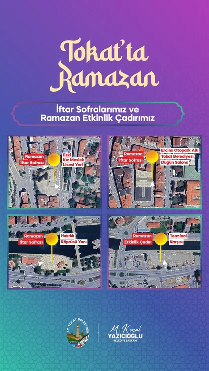 Tokat Belediyesi, Ramazan ayı boyunca Tokat’ın dört ayrı noktasında iftar sofrası kuracak. Vatandaşlar; Eski Kız Meslek Lisesi yerinde, Hıdırlık Köprüsü yanında, Ercins Otopark altı Tokat Belediyesi Düğün Salonu’nda, Terminal karşısındaki Ramazan Etkinlik Çadırı’nda iftar programlarına katılabilecek. Her akşam yüzlerce vatandaşın aynı sofrada buluşacağı iftar organizasyonlarıyla Ramazan’ın paylaşma ve dayanışma ruhu Tokat’ın dört bir yanında hissedilecek.
