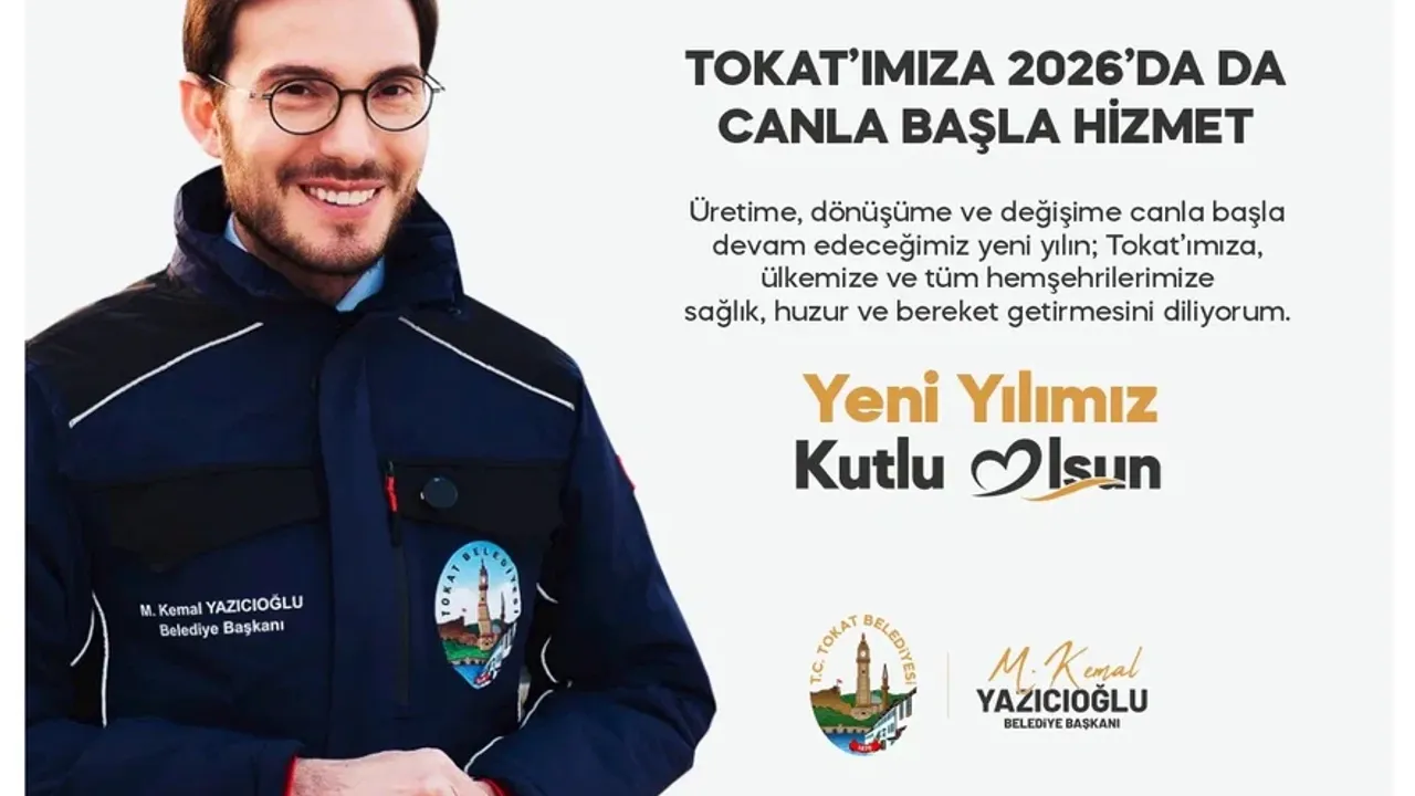 Başkan Yazıcıoğlu mesajında, “Bir yılı daha geride bırakırken; aziz şehrimiz Tokat’a hizmet etmenin onurunu ve sorumluluğunu yüreğimizde hissederek yeni bir yıla daha umutla giriyoruz. Tokat’ımıza 2026 yılında da canla başla hizmet etmeye; alın terini merkeze alan, üretimi önceleyen, dönüşüm ve değişimi insanımızın hayatına değer katan bir anlayışla sürdürmeye kararlıyız. Üretken Belediyecilik vizyonuyla; şehrimizin her mahallesinde, her sokağında Tokatlı hemşehrilerimizin hayatını kolaylaştıran, geleceğe güvenle bakan adımlar atmaya devam edeceğiz. Bizim belediyecilik anlayışımız; milletine sevdalı, memleketine vefalı, devletine sadık bir hizmet anlayışıdır. Tokat’ı büyütürken değerlerimizi koruyan, geçmişten aldığımız güçle geleceği inşa eden bir iradeyle yolumuza devam ediyoruz. Bu duygu ve düşüncelerle; üretime, dönüşüme ve değişime canla başla devam edeceğimiz yeni yılın, Tokat’ımıza, ülkemize ve tüm hemşehrilerimize sağlık, huzur ve bereket getirmesini temenni ediyorum. Yeni yılımız kutlu olsun. Saygı ve muhabbetlerimle” ifadelerini kullandı.