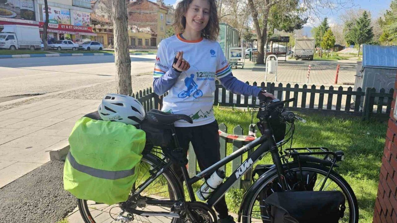Avusturya’dan dünya turu için bisikletiyle tek başına yola çıkarak pedal çevirmeye başlayan kadın bisikletçi, Konya’nın Beyşehir ilçesinde mola verdi.