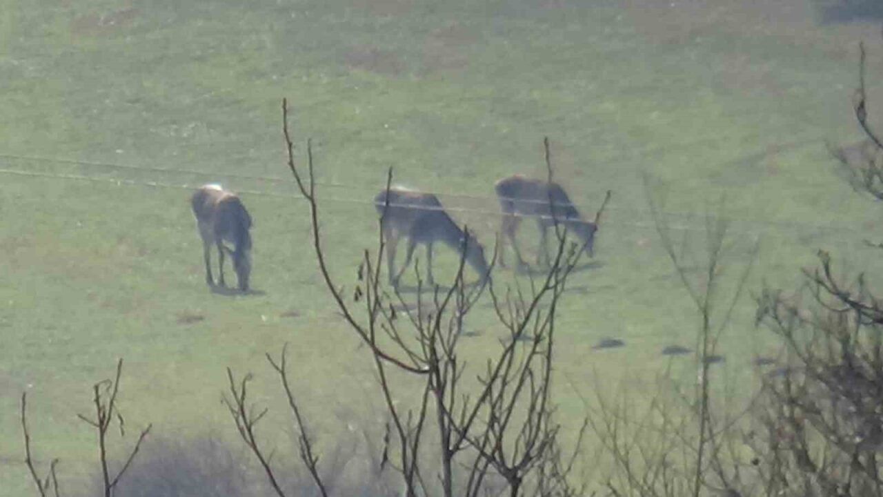 Bolu’nun Mudurnu ilçesinin geçtiğimiz günlerde etkili olan kar yağışları nedeniyle yüksek kesimlerde kar birikintileri oluştu. Ormanlık alanda kar nedeniyle yiyecek bulamayan geyikler, hava sıcaklarının da yükselmesiyle köylerin yanına kadar indi. Köyde ekili tarım alanlarındaki yeşillikleri yiyerek karınlarını doyurmaya çalışan geyiklerin etraftaki araç ve köpek seslerine aldırış etmeden otlaması dikkat çekti.