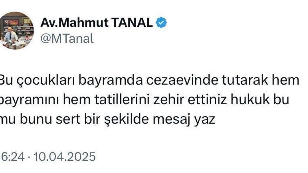 "Bu çocukları bayramda cezaevinde tutarak hem bayramını hem tatillerini zehir ettiniz hukuk bu mu bunu sert bir şekilde mesaj yaz."