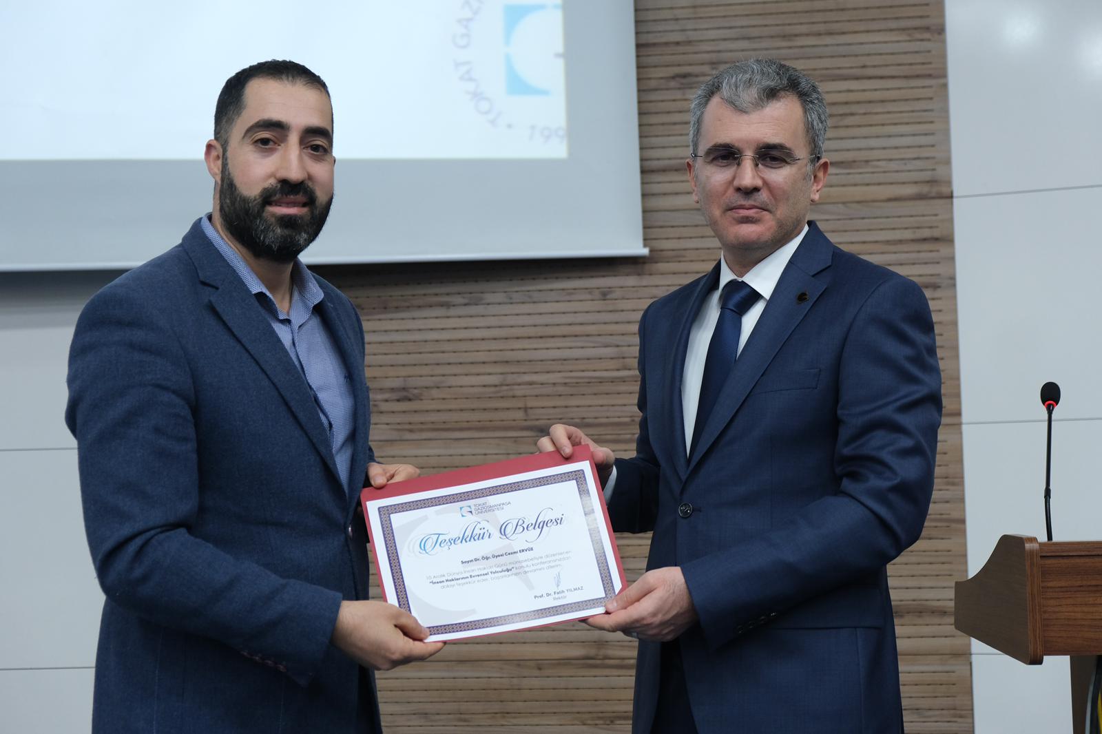 Etkinlik sonunda konuşmacı Dr. Cezmi Ervüz’e katkılarından dolayı teşekkür belgesi takdim edildi.