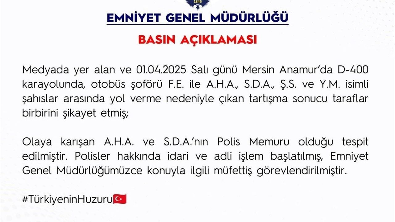 Konuyla ilgili EGM’den yapılan açıklamada, "Medyada yer alan ve 01.04.2025 Salı günü Mersin Anamur’da D-400 karayolunda, otobüs şoförü F.E. ile A.H.A., S.D.A., Ş.S. ve Y.M. isimli şahıslar arasında yol verme nedeniyle çıkan tartışma sonucu taraflar birbirini şikayet etmiş; Olaya karışan A.H.A. ve S.D.A.’nın Polis Memuru olduğu tespit edilmiştir. Polisler hakkında idari ve adli işlem başlatılmış, Emniyet Genel Müdürlüğümüzce konuyla ilgili müfettiş görevlendirilmiştir" ifadeleri yer aldı.
