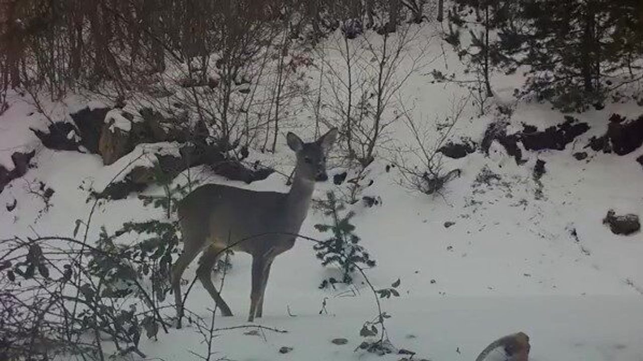 Amasya’da karla kaplı alanda beslenmek için gezinti yapan karacanın görüntüleri fotokapana yansıdı.