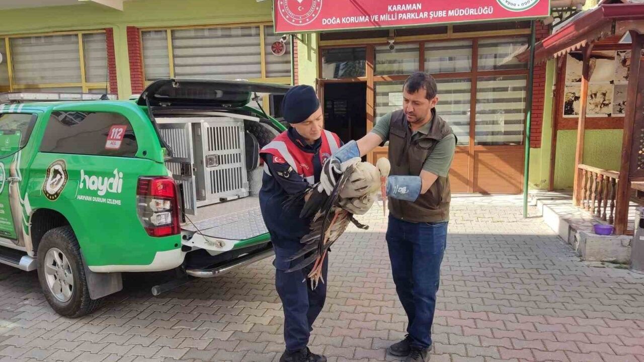 Karaman’da jandarma tarafından yaralı halde bulunan leylek, Doğa Koruma ve Milli Parklar Şube Müdürlüğüne teslim edilerek koruma altına alındı.