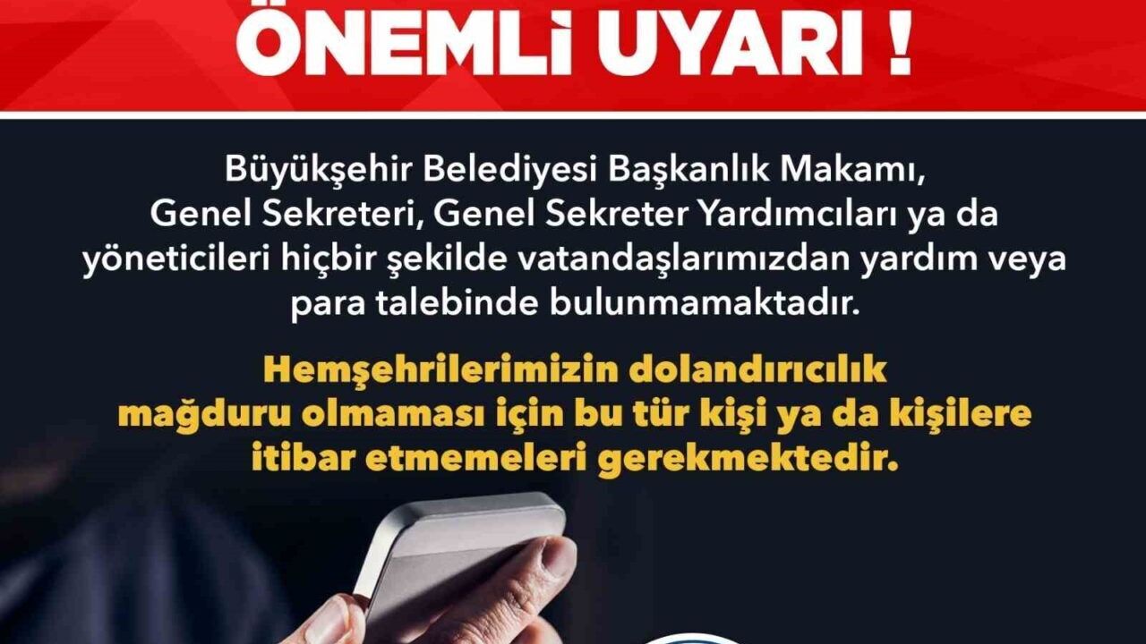 Büyükşehir Belediyesi, son günlerde art niyetli kişilerin belediye adıyla ya da bazı belediye bürokratlarının ismini kullanarak vatandaşlardan para talep ettiği yönünde şikâyetlerin artması üzerine bir uyarı yayınladı.