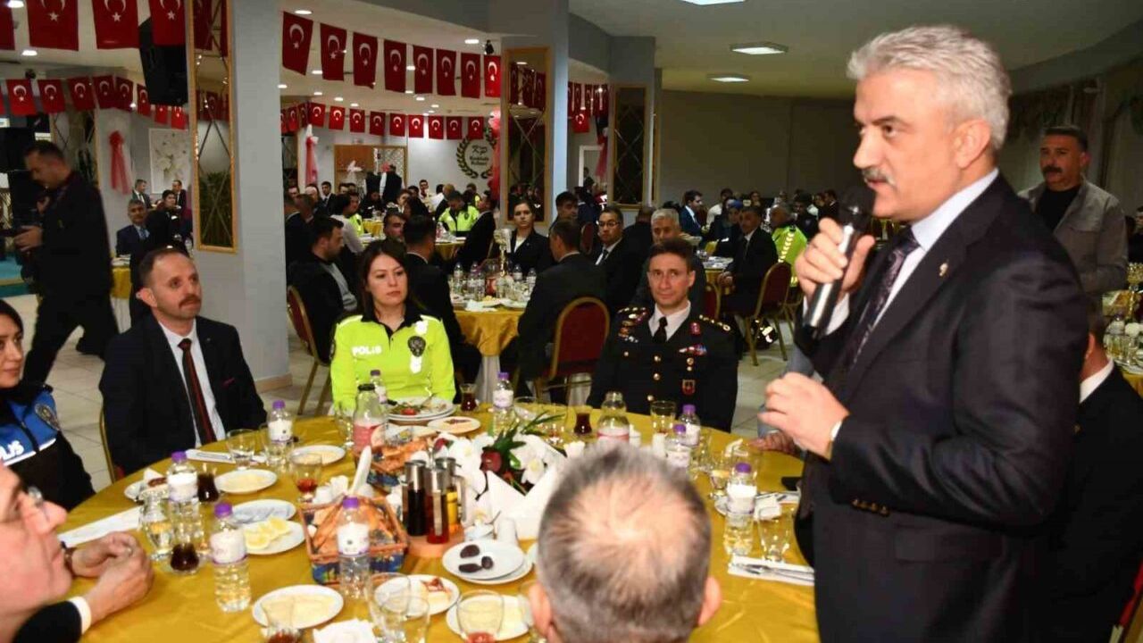Kırıkkale Valisi Mehmet Makas, İl Emniyet Müdürlüğü’nde görev yapan polis memurlarıyla düzenlenen iftar programında bir araya geldi. Ramazan ayının manevi atmosferinde gerçekleşen programda konuşan Vali Makas, vatandaşların huzuru ve güvenliği için fedakarca görev yapan tüm emniyet personeline teşekkür etti. Vali Makas, "Mübarek Ramazan ayının cehennem azabından kurtuluş günleri olan son günlerinde sizlerle birlikte iftar yapmaktan büyük bir mutluluk duyuyoruz. Memleketimizde bayrak inmiyor, ezan susmuyorsa, bunun baş kahramanları emniyet teşkilatımız, jandarma teşkilatımız ve askerimizdir. Huzurumuzun ve rahatlığımızın sebebi, her birinizin görevini en iyi şekilde yapmasından kaynaklanmaktadır. Bugün olduğu gibi, bundan sonra da üstlendiğiniz bu zorlu görevi başarıyla sürdüreceğinize olan inancımız tamdır" ifadelerini kullandı.