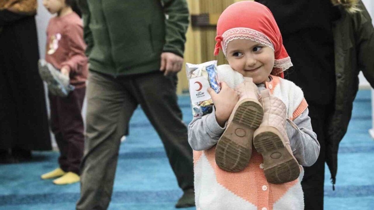 Türk Kızılay gönüllüleri, çocuklar için hazırladıkları hediye paketlerini camideki ayakkabıların içine bıraktı.