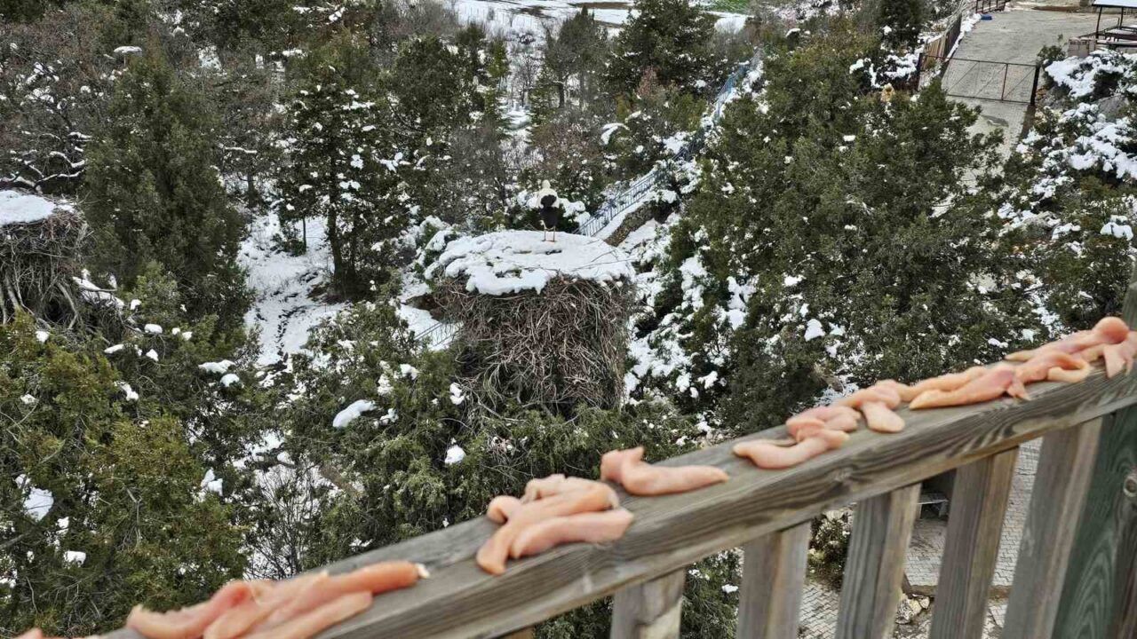 Konya’nın Beyşehir ilçesinde kar yağışı ve ardından etkili olmaya başlayan soğuk hava sürprizi ile karşılaşan leyleklerin yaşam alanı olan yuvalarına besin takviyesi yapıldı.
