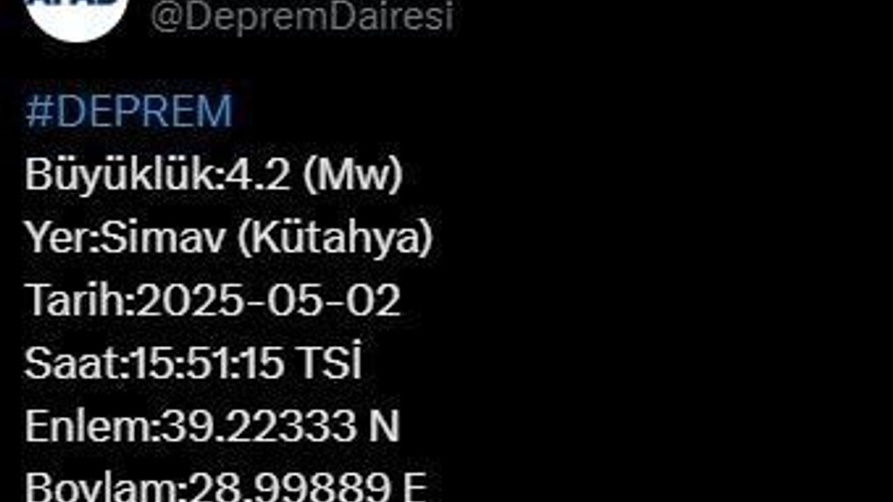 Afet ve Acil Durum Yönetimi Başkanlığının (AFAD) internet sitesinde yer alan bilgiye göre, Kütahya’nın Simav ilçesinde saat 15.51’de 4,2 büyüklüğünde deprem meydana geldi. Depremin 12,55 kilometre derinlikte yaşandığı kaydedildi.