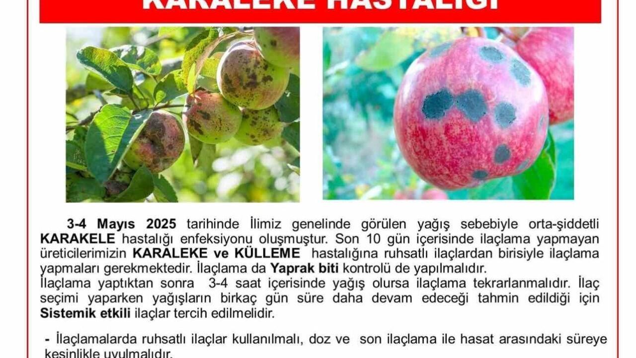 Niğde İl Tarım ve Orman Müdürlüğü, il genelinde etkili olan yağışların ardından elma ağaçlarında karaleke hastalığı riskinin arttığını belirterek üreticilere uyarılarda bulundu.