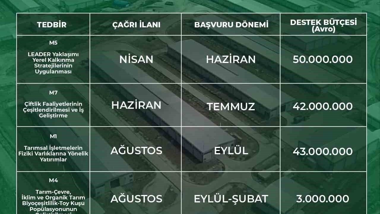 TKDK tarafından yapılan duyuruya göre; Yerel Kalkınma Stratejilerinin Uygulanması kapsamında 50 milyon Euro’luk destek ayrıldı, çağrı ilanı Nisan ayında yapılacak ve başvurular Haziran ayında alınacak. Çiftlik Faaliyetlerinin Çeşitlendirilmesi ve İş Geliştirme için 42 milyon Euro destek sağlanacak, çağrı ilanı Haziran ayında yapılacak ve başvurular Temmuz ayında alınacak. Tarımsal İşletmelerin Fiziki Varlıklarına Yönelik Yatırımlar için 43 milyon Euro destek ayrıldı, çağrı ilanı Ağustos ayında yapılacak ve başvurular Eylül ayında kabul edilecek. Tarım-Çevre, İklim ve Organik Tarım, Biyoçeşitlilik ve Toy Kuşu Popülasyonunun Geliştirilmesi kapsamında 3 milyon Euro destek sağlandı, çağrı ilanı Ağustos ayında yapılacak ve başvurular Eylül ile Şubat ayları arasında alınacak. Tarım ve Balıkçılık Ürünlerinin İşlenmesi ve Pazarlanması ile İlgili Yatırımlar için 50 milyon Euro destek sağlanacak, çağrı ilanı Eylül ayında yapılacak ve başvurular Ekim ayında alınacak.