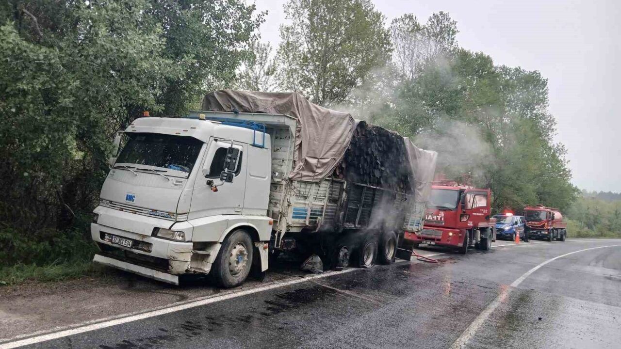 Karabük’ün Yenice ilçesinde seyir halindeyken alev alan odun yüklü kamyonda çıkan yangın itfaiye ekiplerince büyümeden söndürüldü.