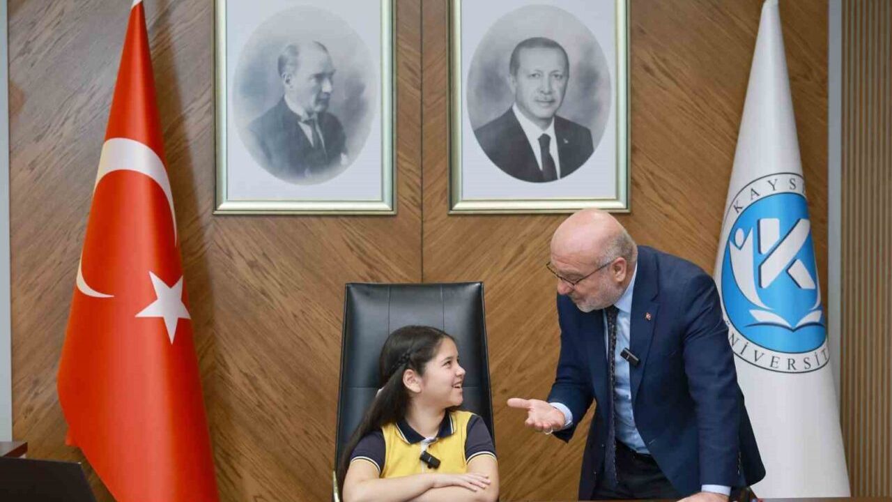 23 Nisan Ulusal Egemenlik ve Çocuk Bayramı’nın 105. yıldönümü dolayısıyla rektörlük makamında gerçekleştirilen programda, Talas Şehit Burhan Kaplan İlkokulu 4. sınıf öğrencisi 10 yaşındaki Defne Sipahioğlu, temsili olarak rektör koltuğuna oturdu. Oturduğu makamda, barış ve huzurun hakim olduğu bir dünyada tüm dünya çocuklarının mutlu ve huzurlu yaşam sürmesi temennisinde bulunan ilkokul öğrencisi Defne Sipahioğlu, gelecekte İngilizce öğretmeni ve yazar olmak istediğini, şiir yazmayı çok sevdiğini söyledi.