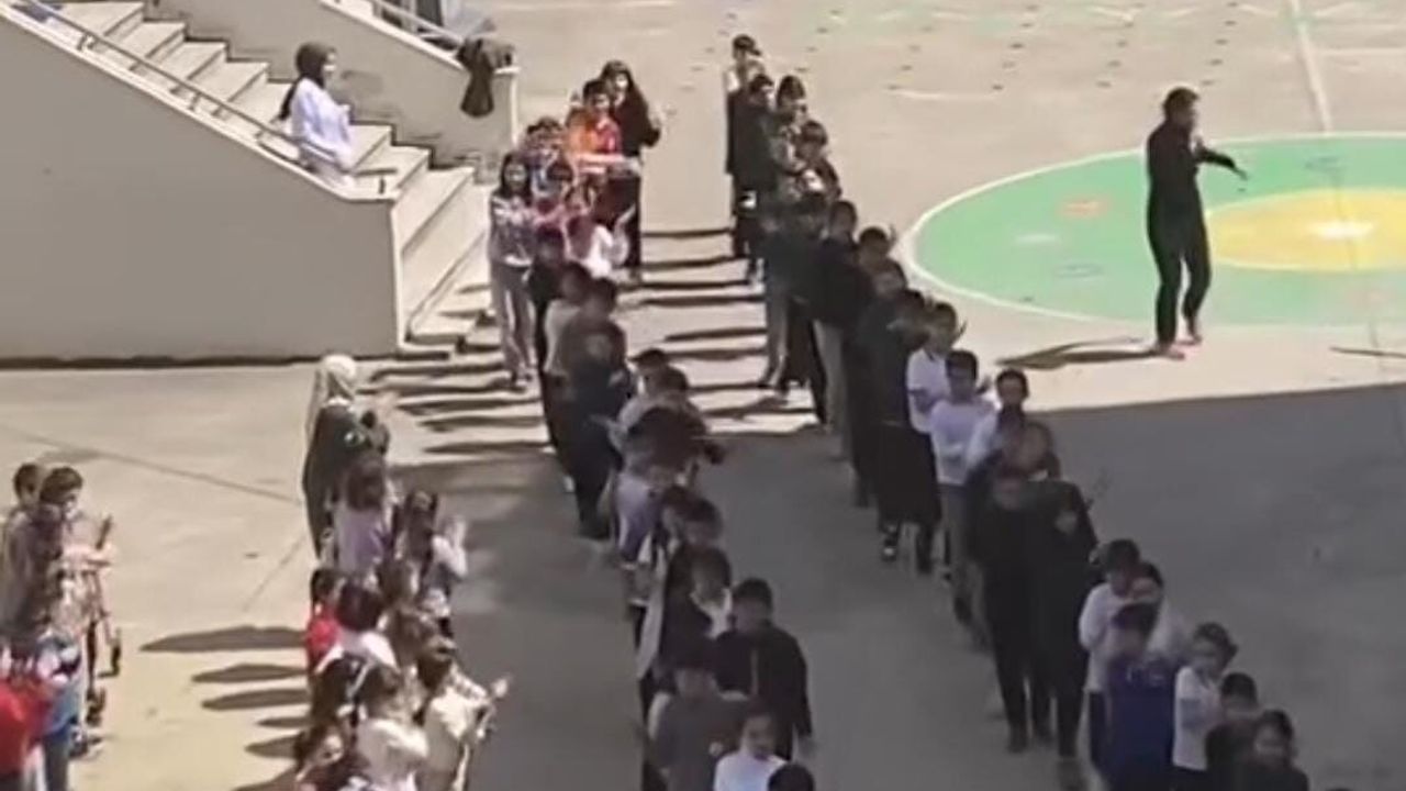 Rize’de bir inşaatın dış cephesinde çalışan usta, o esnada bitişikteki okulda 23 Nisan için hazırlanan çocukların müziğine halay çekerek eşlik etti.