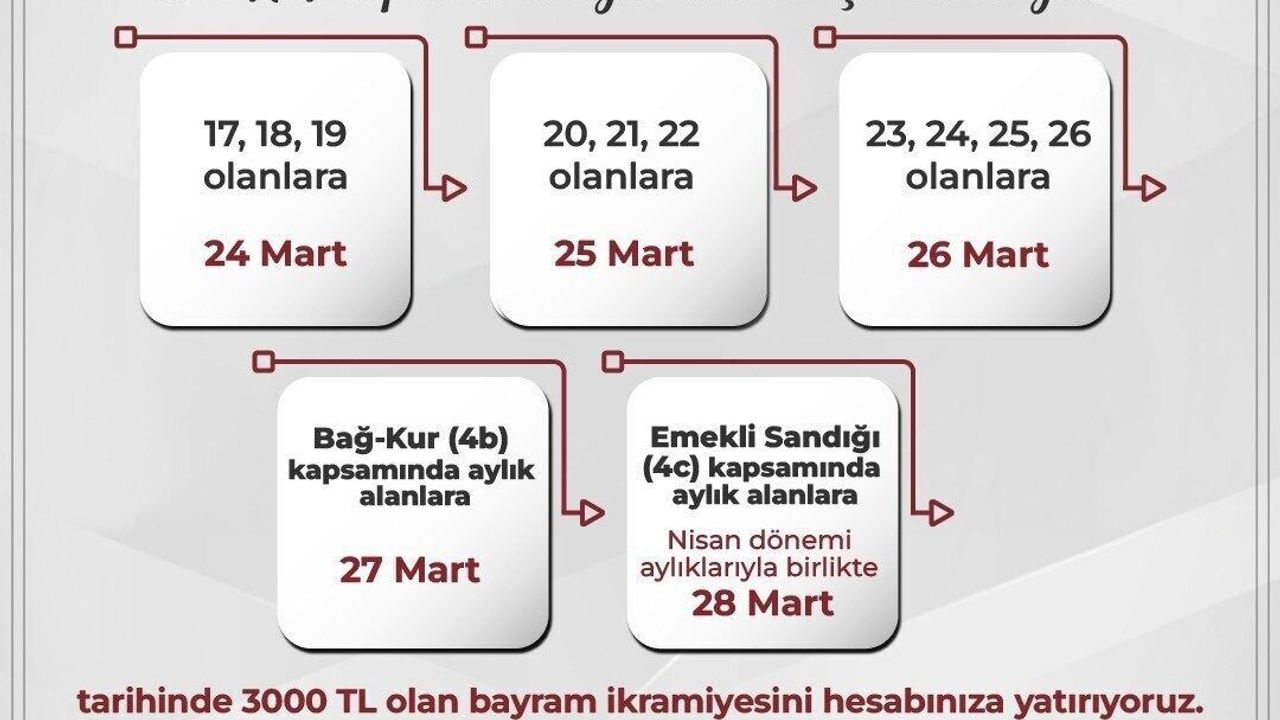 SGK, sosyal medya hesabı üzerinden Ramazan Bayramı ikramiyesinin 24 Mart tarihinden itibaren ödenmeye başlayacağını duyurdu. SSK(4a) kapsamında aylık alanlar için ödeme günü 17,18,19 olan vatandaşlar 24 Mart’ta, 20,21,22 olan vatandaşlar 25 Mart’ta, 23,24,25,26 olan vatandaşlar 26 Mart’ta, Bağ-Kur (4b) kapsamında aylık alan vatandaşlar 27 Mart’ta ve Emekli Sandığı (4c) kapsamında aylık alanlara Nisan dönemi aylıkları ile 28 Mart tarihinde 3 bin TL olan bayram ikramiyelerin hesaba yatırılacağı kaydedildi.