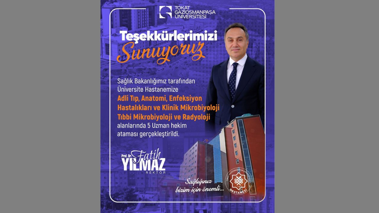 Tokat Gaziosmanpaşa Üniversitesi Rektörü Prof. Dr. Fatih Yılmaz; Adli Tıp, Anatomi, Enfeksiyon Hastalıkları ve Klinik Mikrobiyoloji, Tıbbi Mikrobiyoloji ile Radyoloji alanlarında beş uzman hekimin hastaneye atandığını duyurdu.