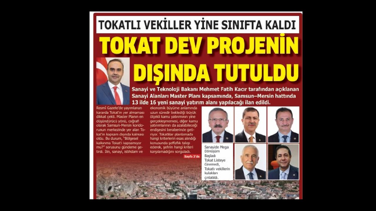 Sanayi ve Teknoloji Bakanı Mehmet Fatih Kacır’ın "Sanayi Alanları Master Planı" kapsamında ilan ettiği 16 yeni dev sanayi yatırım alanı arasında Tokat yer almadı. Komşu illerin listede olmasına rağmen Tokat’ın devre dışı bırakılması şehrin potansiyelinin yeterince değerlendirilmediğine dair kaygıları artırdı. Vatandaşlar Tokat’ta üretimin zayıflatılmaması adına bu kararın gözden geçirilmesini ve kentin ivedilikle sanayi hamlesine entegre edilmesini talep ediyor.