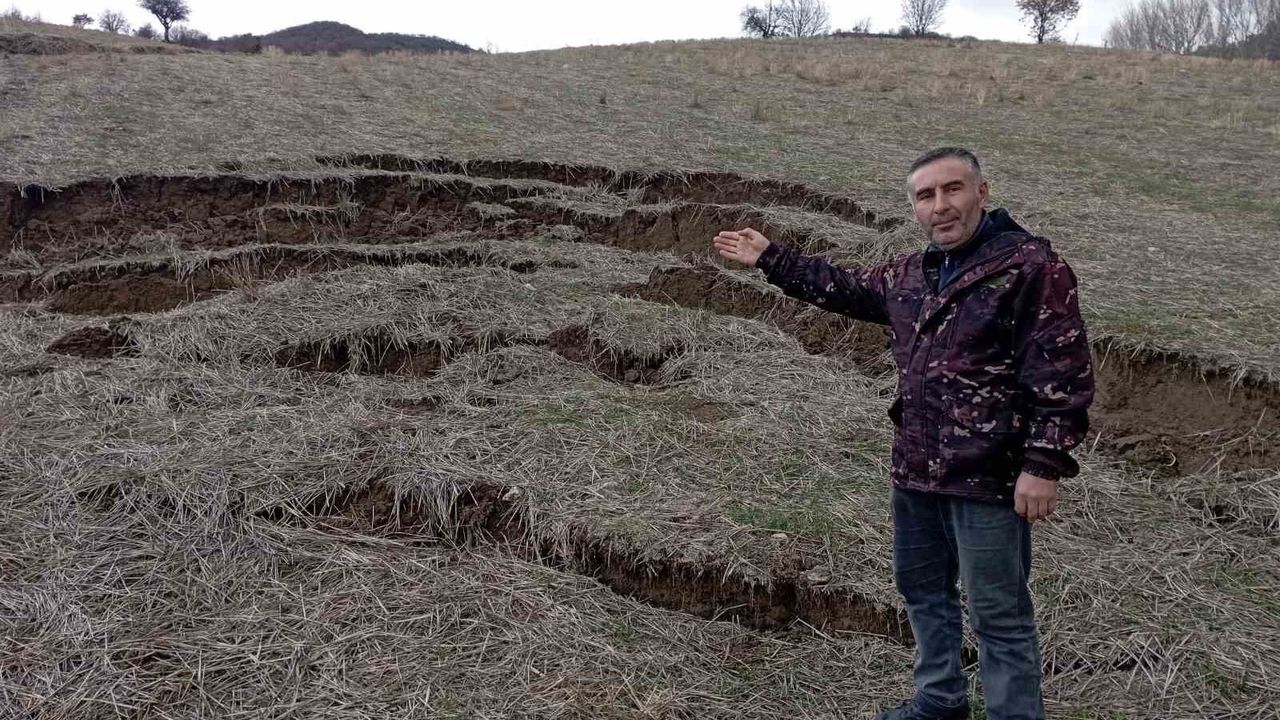 Tarla sahibi Necmettin Türklü, son dönemde artan yağışların zemini yumuşattığını belirterek, arazisinin bir bölümünün kaydığını söyledi. Türklü, 'Bu sene yağışların fazla olması sebebiyle tarlamızın bir kısmında heyelan oluştu. Yaklaşık 200 metrekarelik alan yer değiştirdi. Tarlamız şu an kullanılamaz durumda. Çok şükür ki herhangi bir can kaybı ya da yaralanma yaşanmadı' dedi.