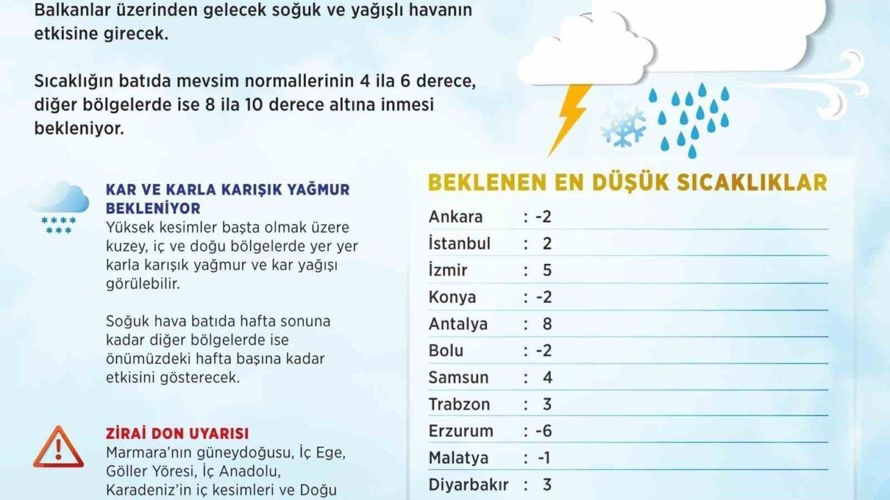 Mevsim normalleri civarında seyreden hava sıcaklıkları, yarından itibaren kuzeybatı kesimlerden başlayarak yurt genelinde azalacak. Sıcaklığın batı kesimlerde mevsim normallerinin 4 ila 6 derece, diğer bölgelerde ise 8 ila 10 derece altına inmesi bekleniyor. Soğuk havanın, yurdun batısında hafta sonuna kadar, doğusunda ise önümüzdeki hafta başına kadar etkili olacağı tahmin ediliyor. Soğuk havayla birlikte, yüksek kesimler başta olmak üzere kuzey, iç ve doğu bölgelerde yer yer karla karışık yağmur ve kar yağışlarının görülmesi bekleniyor.
