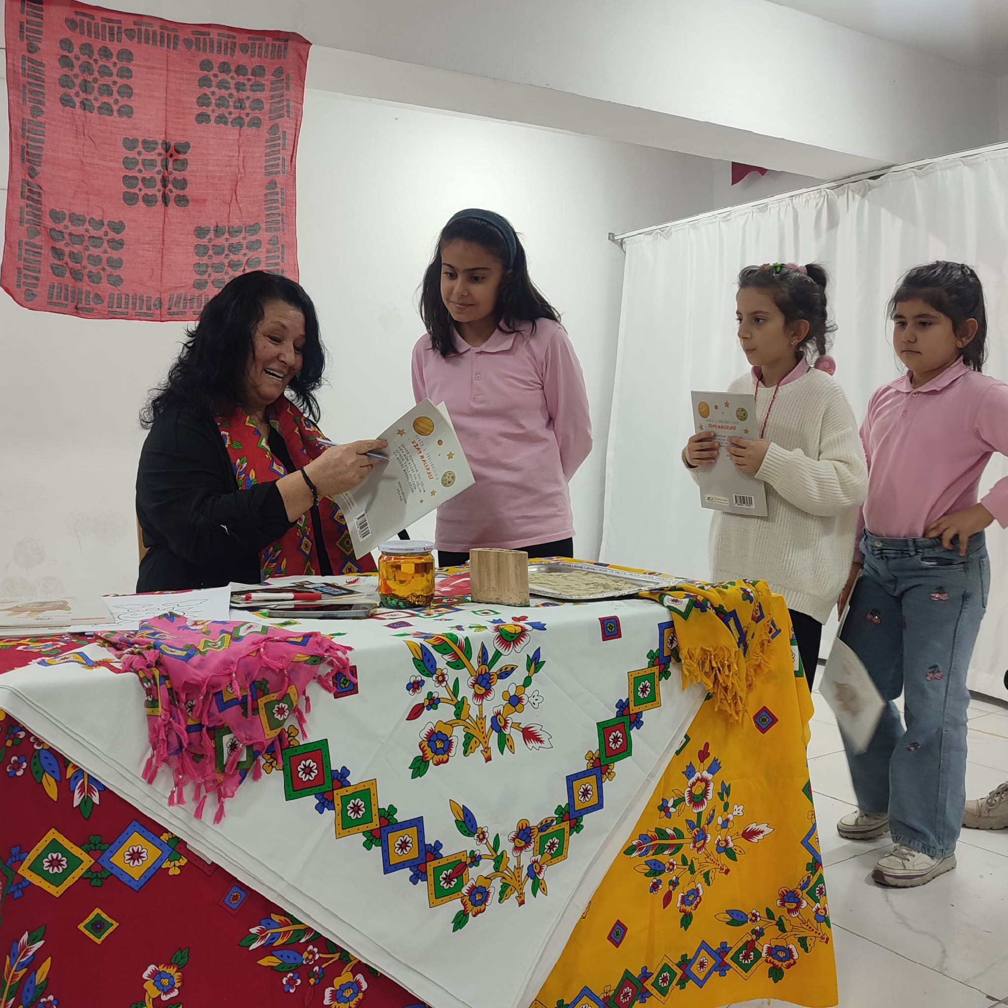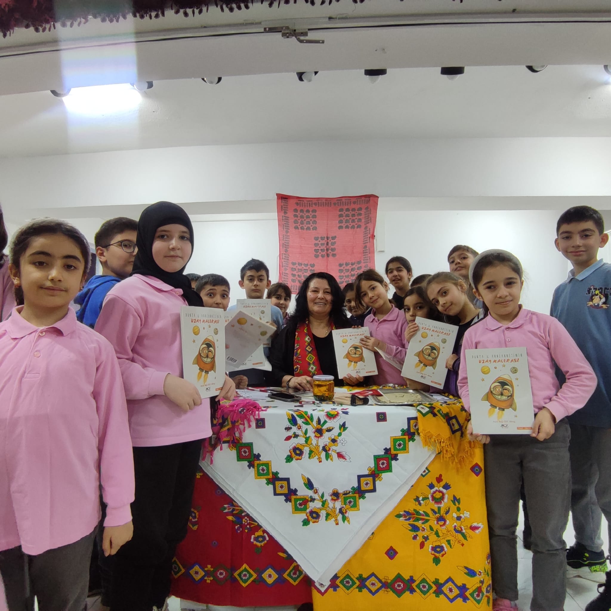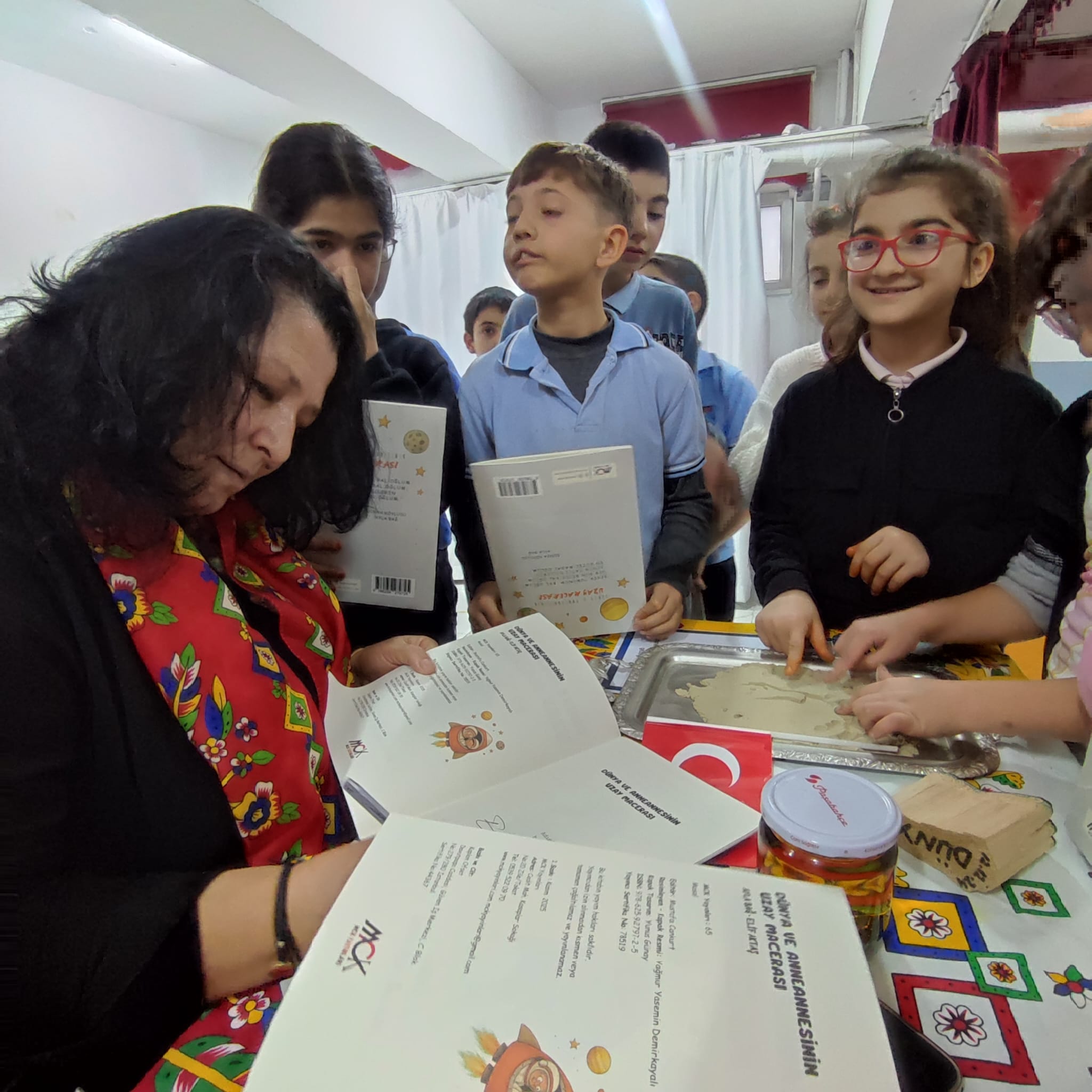 Yazar Ayla Bağ, İngilizce çevirisini İngilizce öğretmeni yazar Elif Aktaş’ın yaptığı “Dünya ve Anneannesinin Uzay Macerası” kitabı üzerine bilgiler verirken, öğrencilerin uzaya ilgisi olduklarını gözlemledi. Etkinlikte öğrenci Melisa Binbaş sahneye davet edilerek, uzayda ayak izi bırakma fikrinden yola çıkılarak oyun hamurundan hazırlanan yüzeye tahta baskıyla ayak izi basıldı.