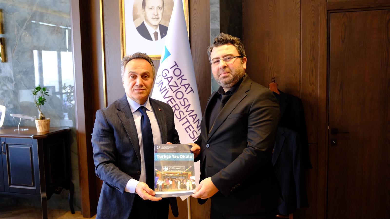 TÖMER Müdürü Dr. Öğr. Üyesi Ahmet Akgül, TOGÜ’de yürütülen yaz okulu programına verdikleri destek dolayısıyla Rektör Prof. Dr. Fatih Yılmaz’a teşekkür ederek, program kapsamında hazırlanan bülteni Rektör Yılmaz’a takdim etti.
